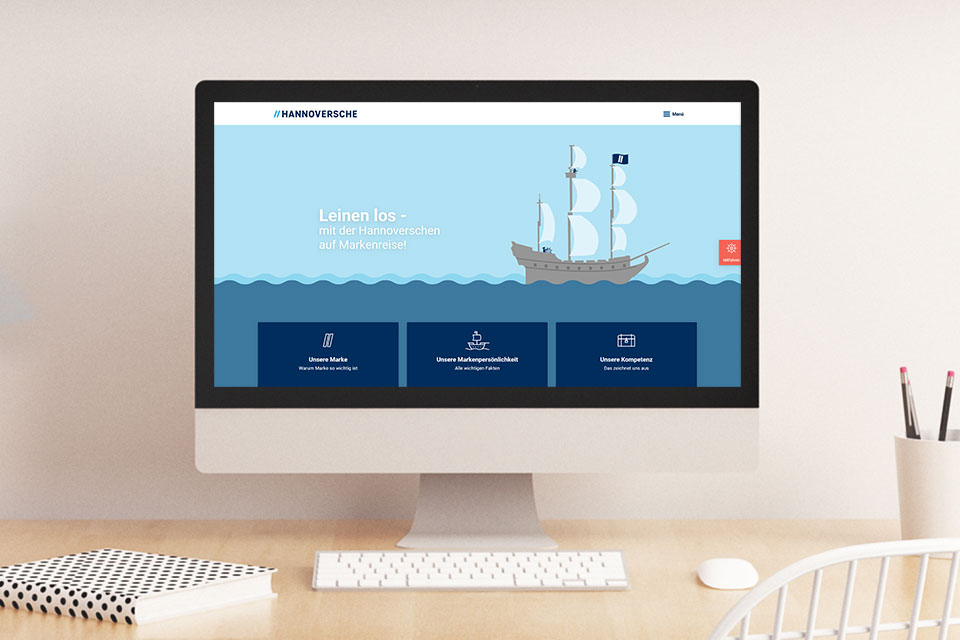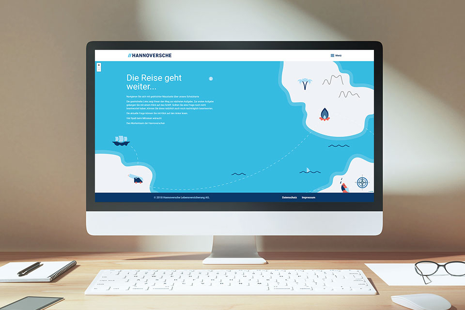 Die Hannoversche geht auf Reisen: Sie begleitet die neue Postitionierung ihrer eigenen Marke. Damit die Mitarbeitenden das Abenteuer einer neuen Strukturierung miterleben dürfen, gibt es für sie die Markenreise. Jeden Monat gibt es eine neue Frage zum Unternehmen – wenn der oder die Mitarbeitende diese richtig beantwortet, erhält er oder sie einen Stempel im analogen Reisepass. Wenn alle Stempel gesammelt sind, geht’s ab in den Lostopf mit der Chance zum Hauptgewinn.