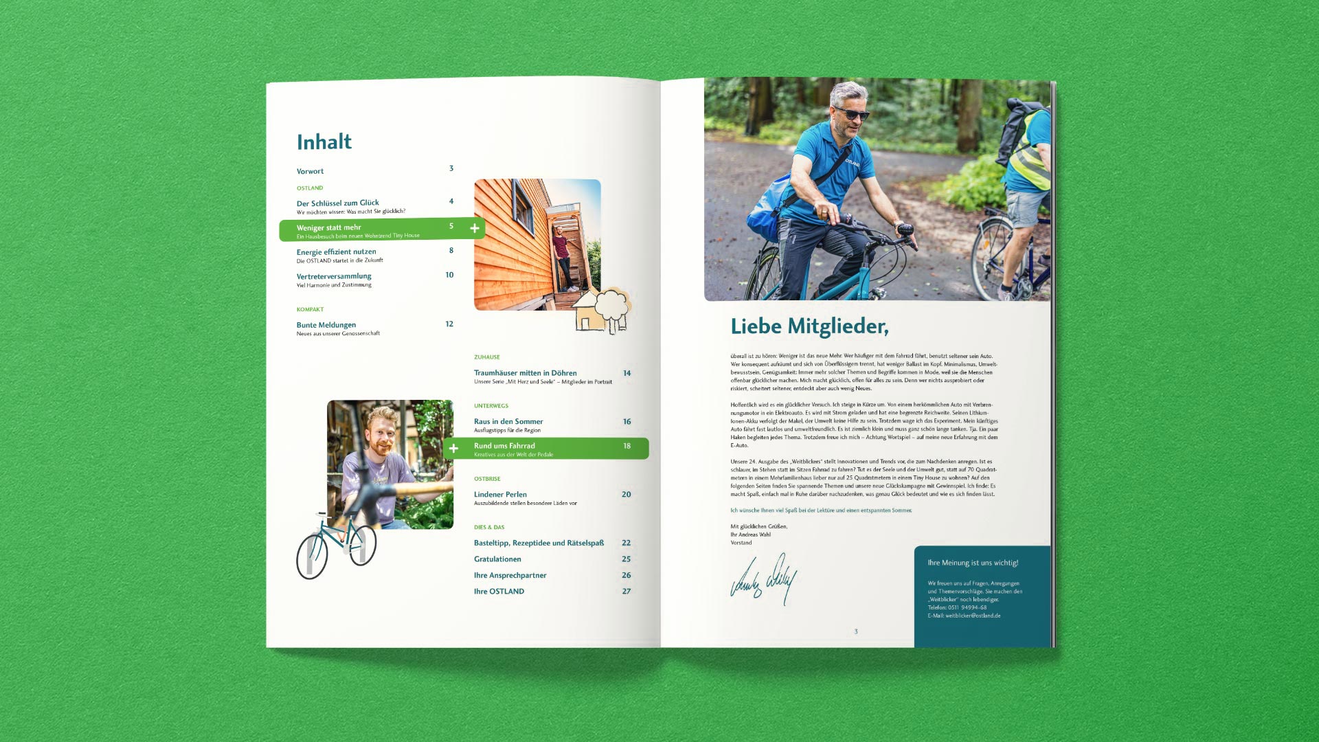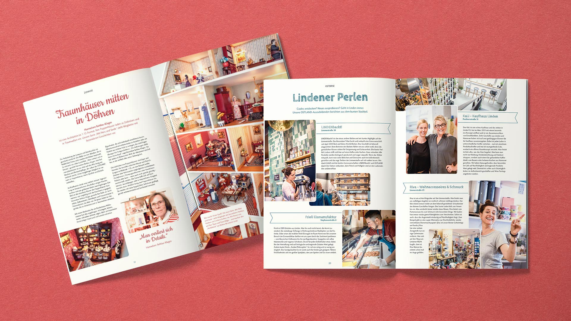 Das Mitgliedermagazin „Weitblicker“ der OSTLAND bietet vielfältige Artikeln rund um das Thema Wohnen, Hannover und Freizeitgestaltung. Wir übernehmen regelmäßig das Layout, die Bildbearbeitung und das Anfertigen von Illustrationen. So entsteht zweimal im Jahr ein liebevoll gestaltetes Magazin mit vielen Details zum Entdecken.