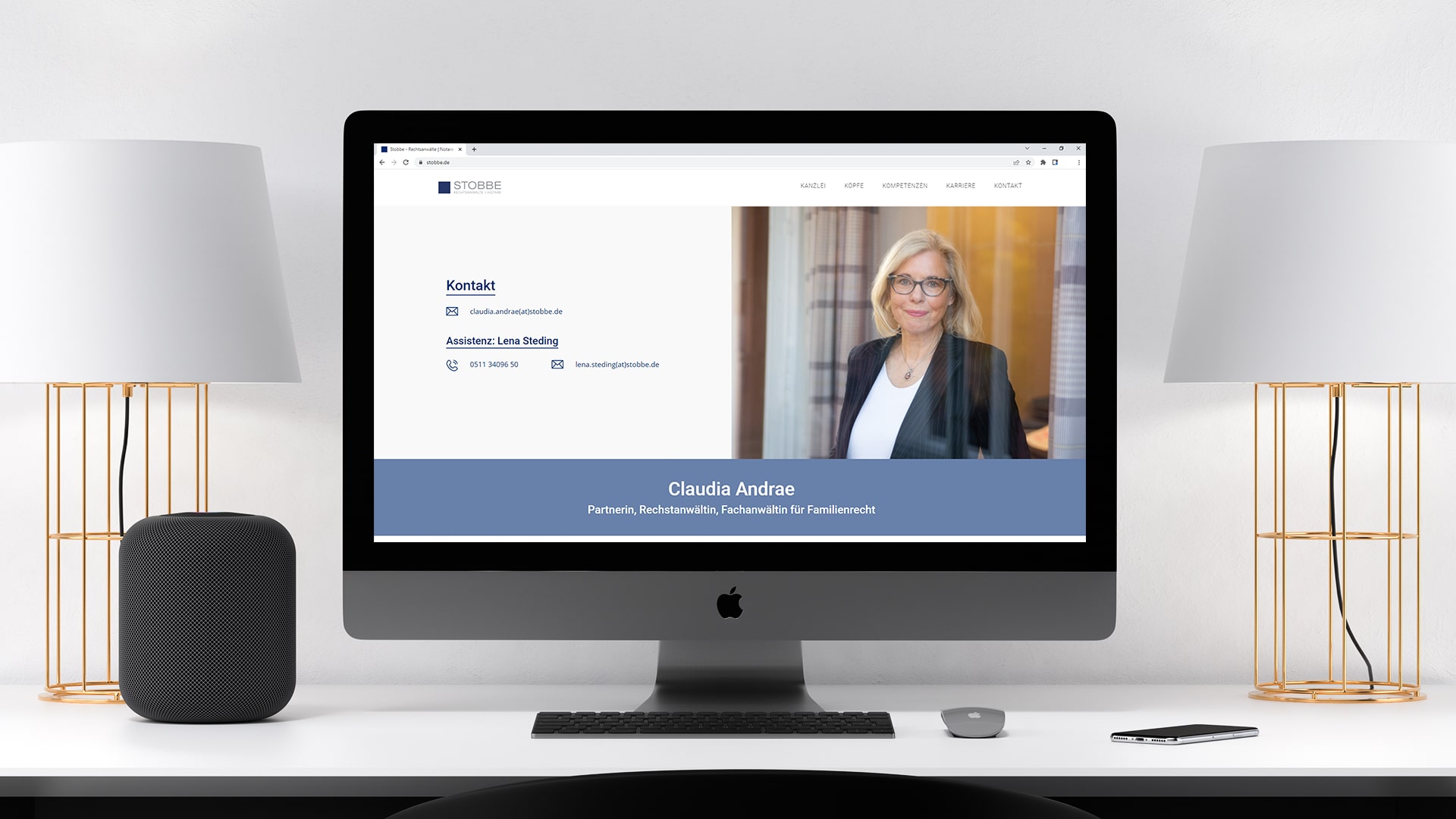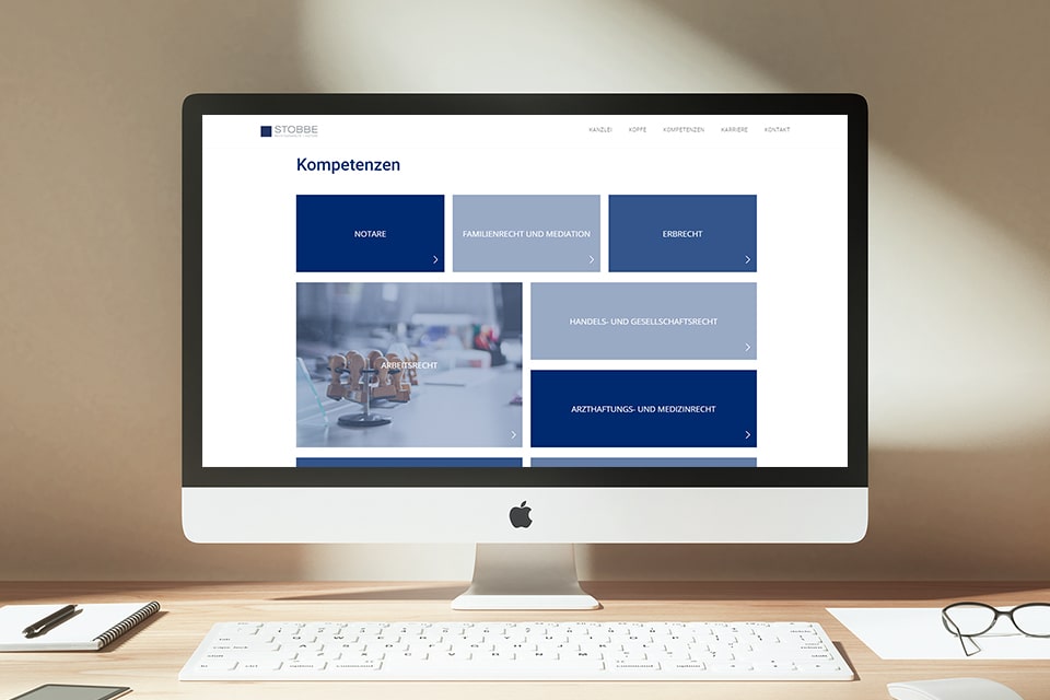 Wir haben eine Website im Onepager-Stil für die Anwaltskanzlei Stobbe angefertigt, welche den Benutzer:innen eine besonders einfache Usability ermöglicht. Das dem Logo entsprechende blaue Quadrat fungiert als optischer roter Faden für die gesamte Seite. Auch sonst ist die Website von klaren Linien dominiert, welche die Philosophie der Rechtsanwälte verkörpert.