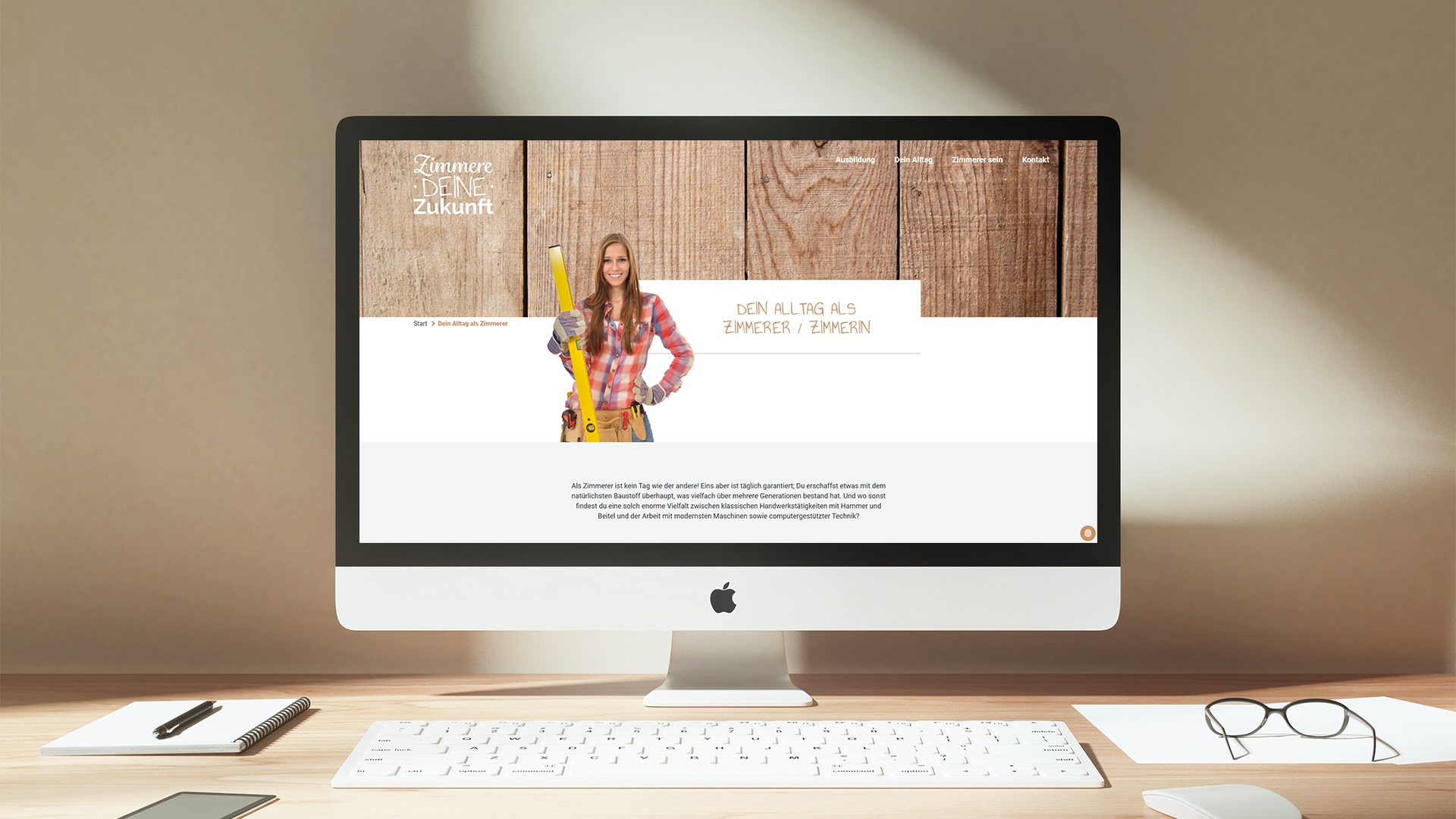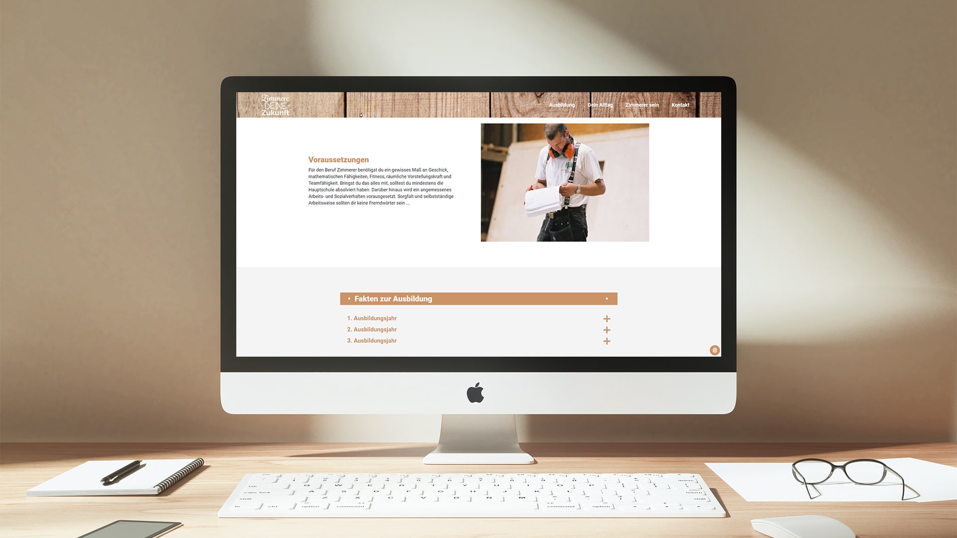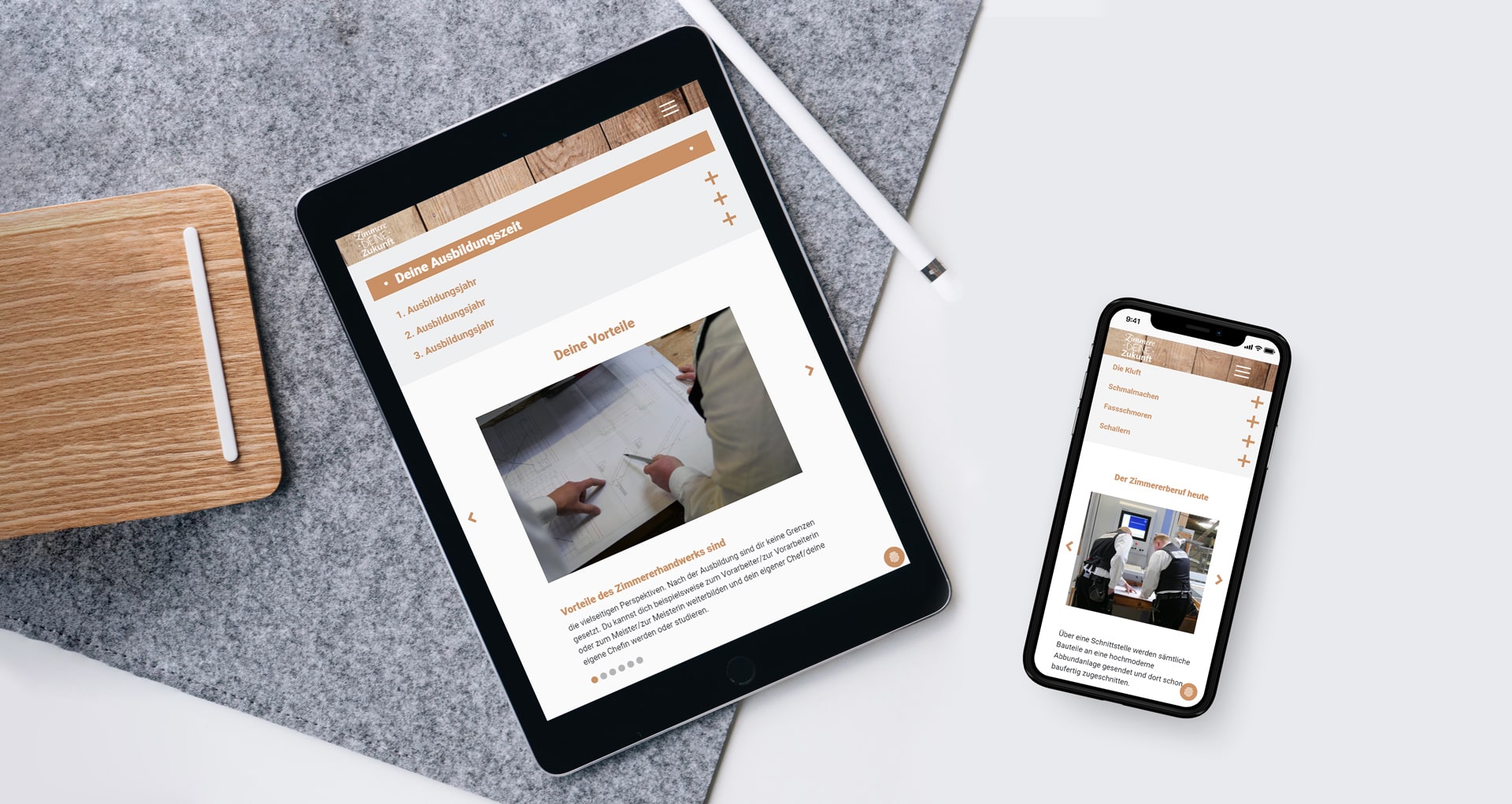 Die definierte Corporate-Farbe, Typografie und die Holzstruktur sind wesentliche Elemente, die anschließend in das Website-Layout mit eingeflossen sind. Auszubildende und Interessierte finden auf der Website des VNZ zielgruppengerecht, transparent und anschaulich Informationen zum Ausbildungsberuf und Arbeitsalltag als Zimmerer:in. klartxt war in diesem Projekt von der Beratung und dem Gestaltungskonzept, über den Layout-Prozess, bis hin zur technischen Umsetzung komplett verantwortlich und betreut den VNZ auch darüber hinaus zum Beispiel mit Vorlagen für Social Media-Post der angehörigen Betriebe.
